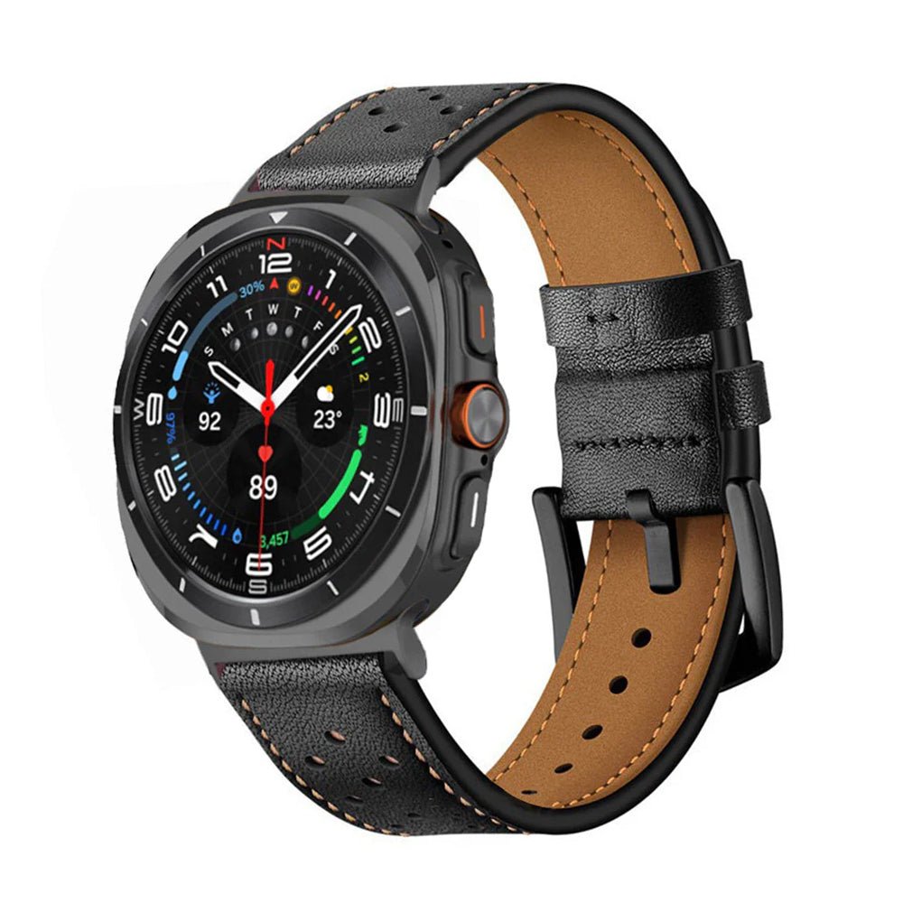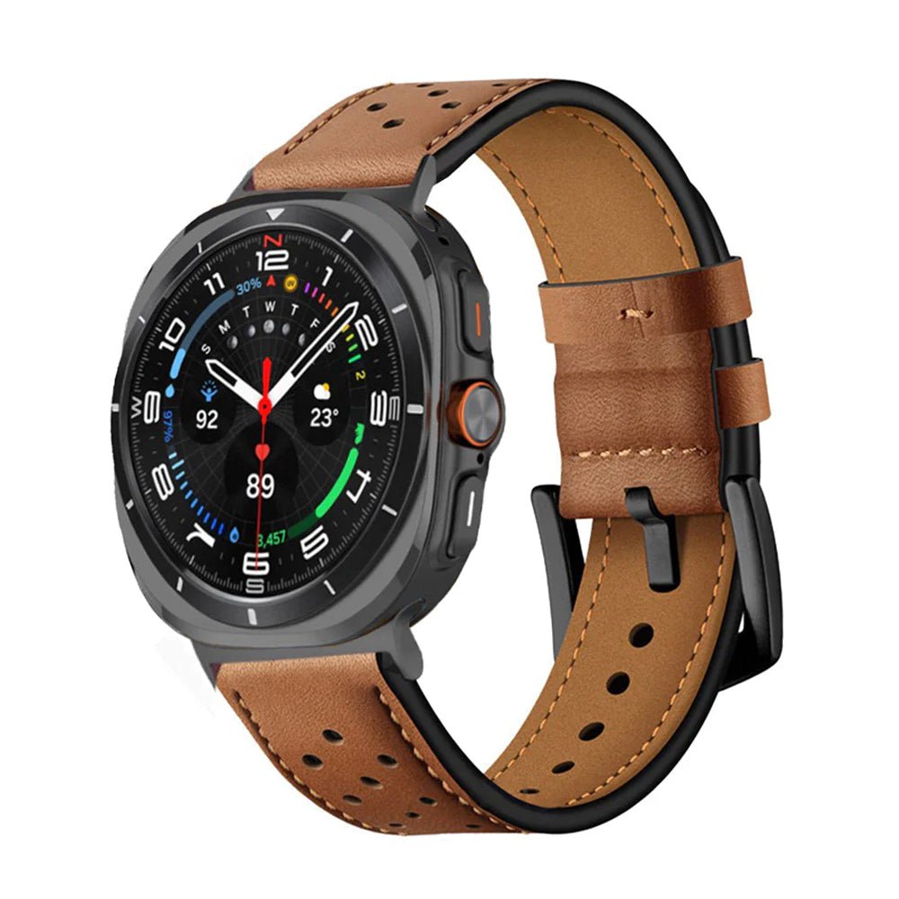 The softness of the leather ensures a comfortable fit on your wrist, and thanks to itsstainless steel buckle clasp, the strap attaches securely to yourSamsung Galaxy Watch Ultra, giving you peace of mind all day long.
