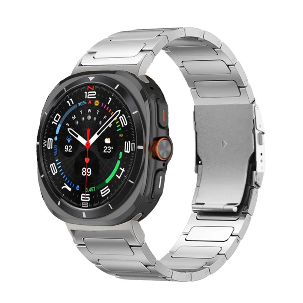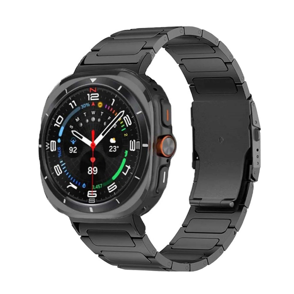 Compatibility: Galaxy Watch Ultra Clasp type : Adjustable buckle Length: Adjustable from 14cm to 23cm Material: Titanium Connector type: Ultra With this product, we offer a tool for removing links and thus adjusting the size of your strap.